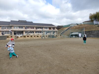 この凧は1年生がつくったものです。こうやって上げるんだとやり方を示しながら、6年生も凧揚げを楽しんでいました。今日は適度に風が吹き、凧揚げにはいい状況で、糸をたくさん伸ばして凧を高くあげていました。少し肌寒い中でしたが、いい凧あげ交流になりました。